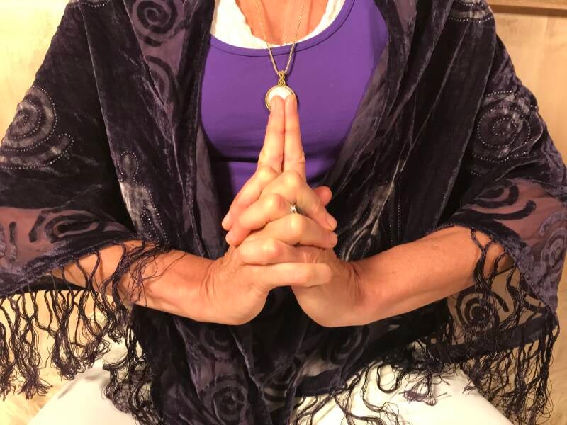 Formation of the Mudra: Cross your fingers in a prayer position and point your index fingers towards the sky.