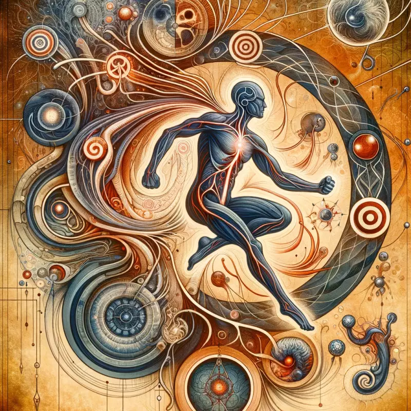 An artwork depicting the 'Plane of Circulation' (Vyona-loka), symbolizing the vital air responsible for circulating pranic energy throughout the body. The central theme is a figure representing the player, with visual elements that illustrate the flow of vyana throughout the bodily systems. This figure is depicted in a dynamic pose, symbolizing the movement and energy of vyana as it carries oxygen and pranic energy through the blood flow. Surrounding the figure are imagery of blood vessels, capillaries, and symbolic representations of glandular secretions and sweating, highlighting vyana's role in these processes. The background features abstract elements that convey the idea of circulation and movement, such as swirling patterns or flowing lines. The overall mood is one of vitality and balance, emphasizing vyana's importance in balancing body chemistry through blood circulation, sweating, and other bodily functions, capturing the essence of vyana as a vital force in the yogic system.